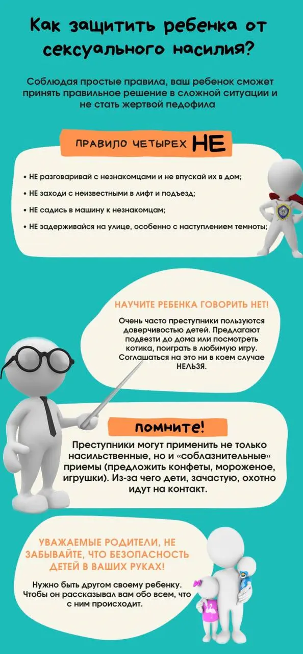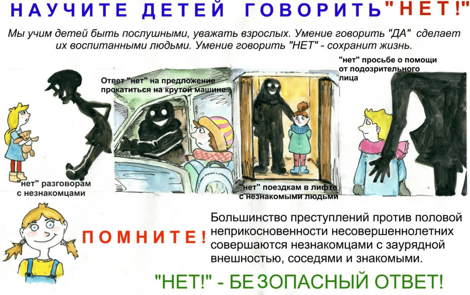 что не следует подчиняться каждому взрослому только из-за того, что тот старше. Научите ребенка твердо говорить «нет» в случае любого посягательства на его неприкосновенность.